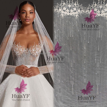 Tecido de Renda Tule Frisado Branco com Pérolas Lantejoulas de Cristal e Bordado de Luxo para Noivas por 5 Jardas HY1544-5
